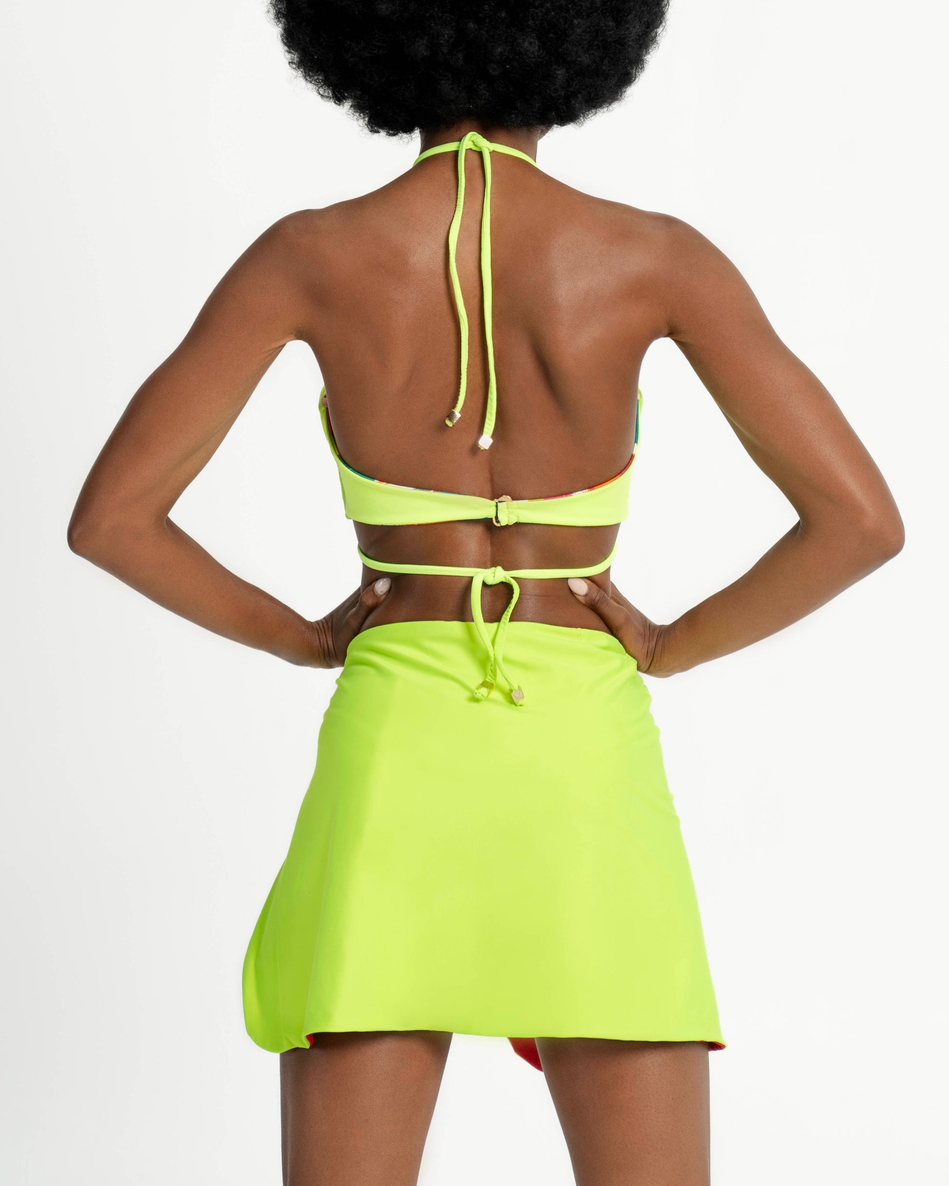 Reversible mini skirt designed to sit at the waist with a sleek, flattering fit. Features a statement O-ring detail for a modern touch, while the form-fitting Lycra blend ensures comfort and flexibility. One side showcases a vibrant neon lime, and the reverse a deep, passionate red—two bold looks in one versatile piece. Perfectly paired with the Carabobo print from the MARA collection, it elevates any outfit with confident color.
