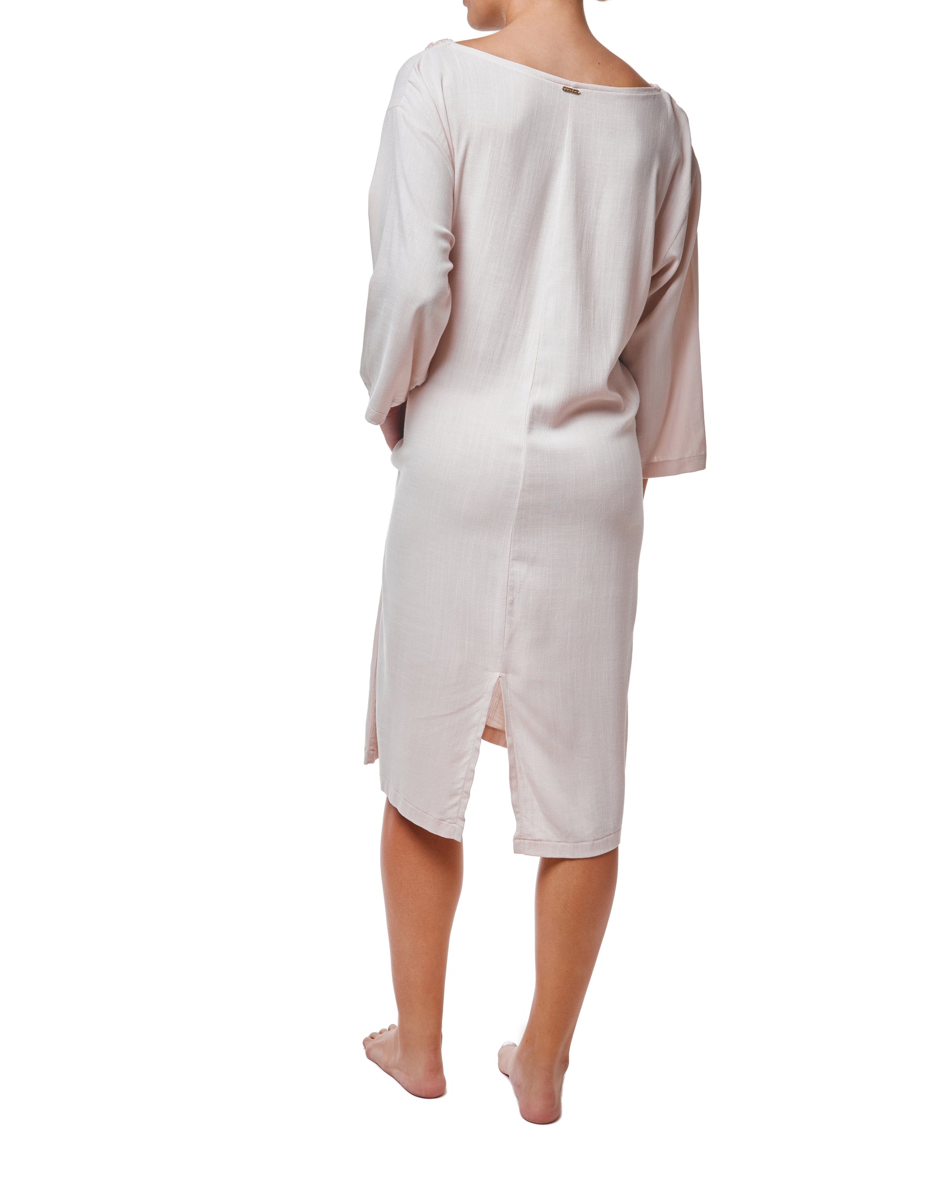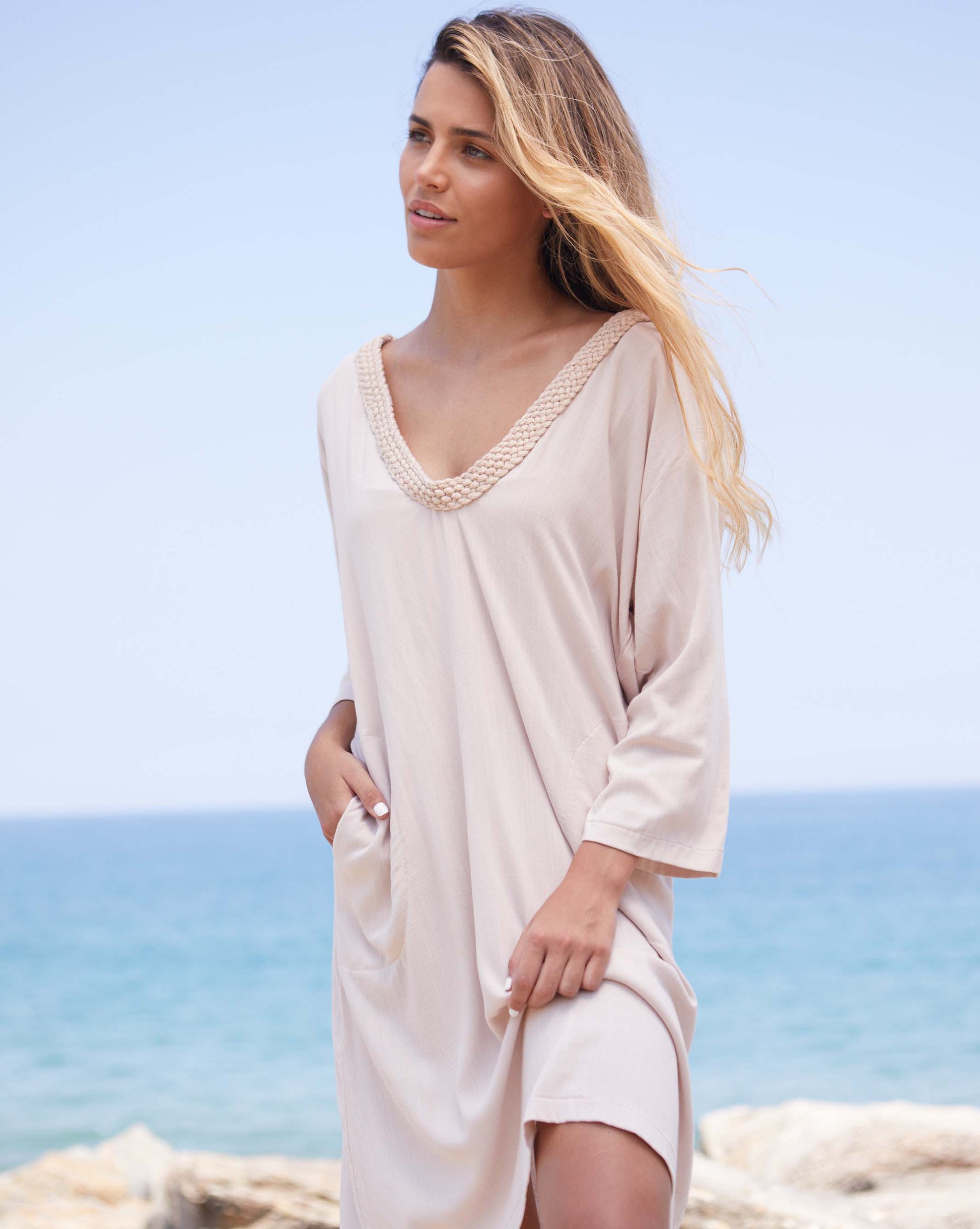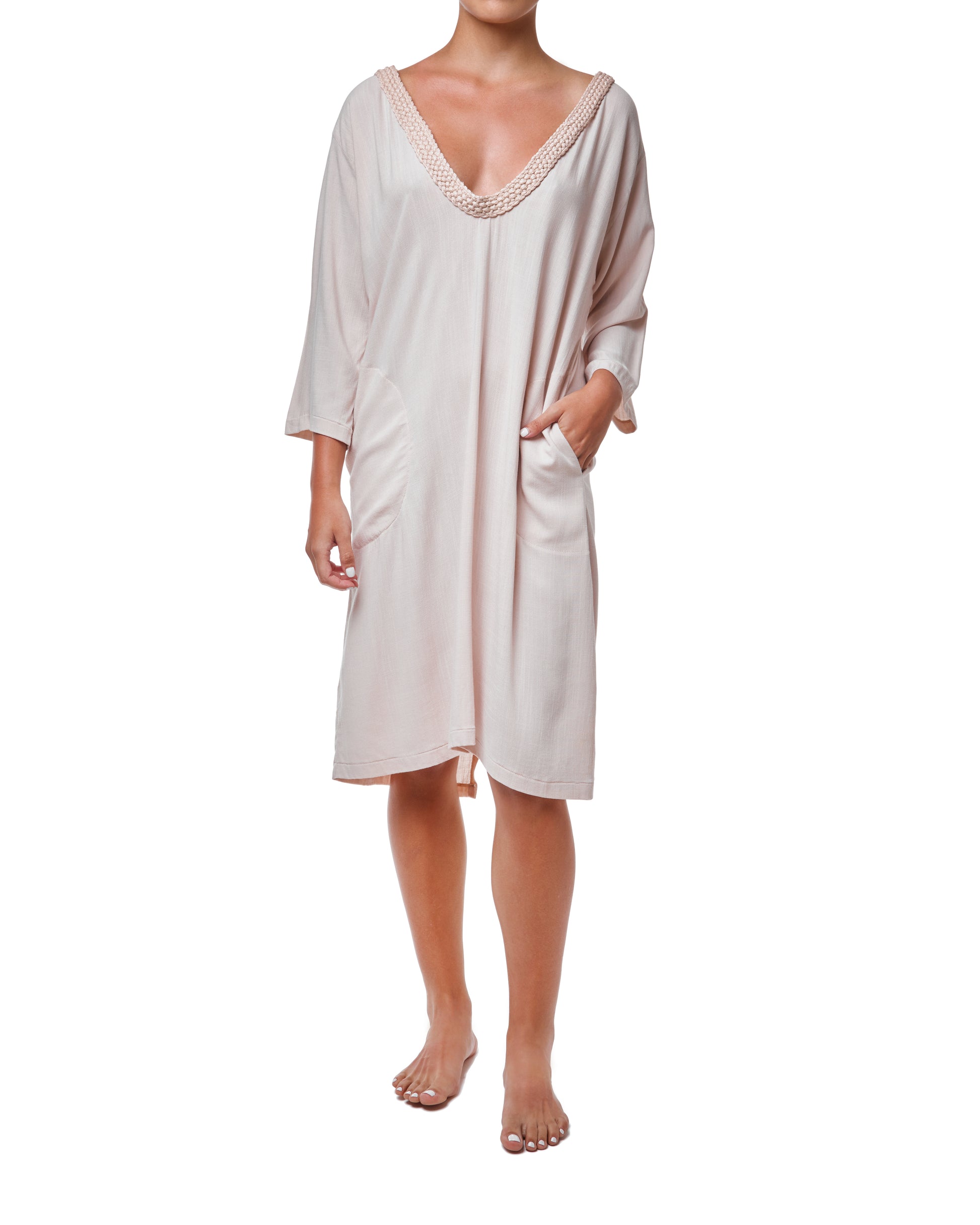 Knee-length tunic dress combining comfort with elegant craftsmanship. A V-neckline accented with a hand-braided cotton cord adds a subtle artisanal detail. Loose quarter sleeves provide a relaxed, airy fit, while deep side pockets offer practical functionality. A back slit enhances mobility and ensures all-day comfort.