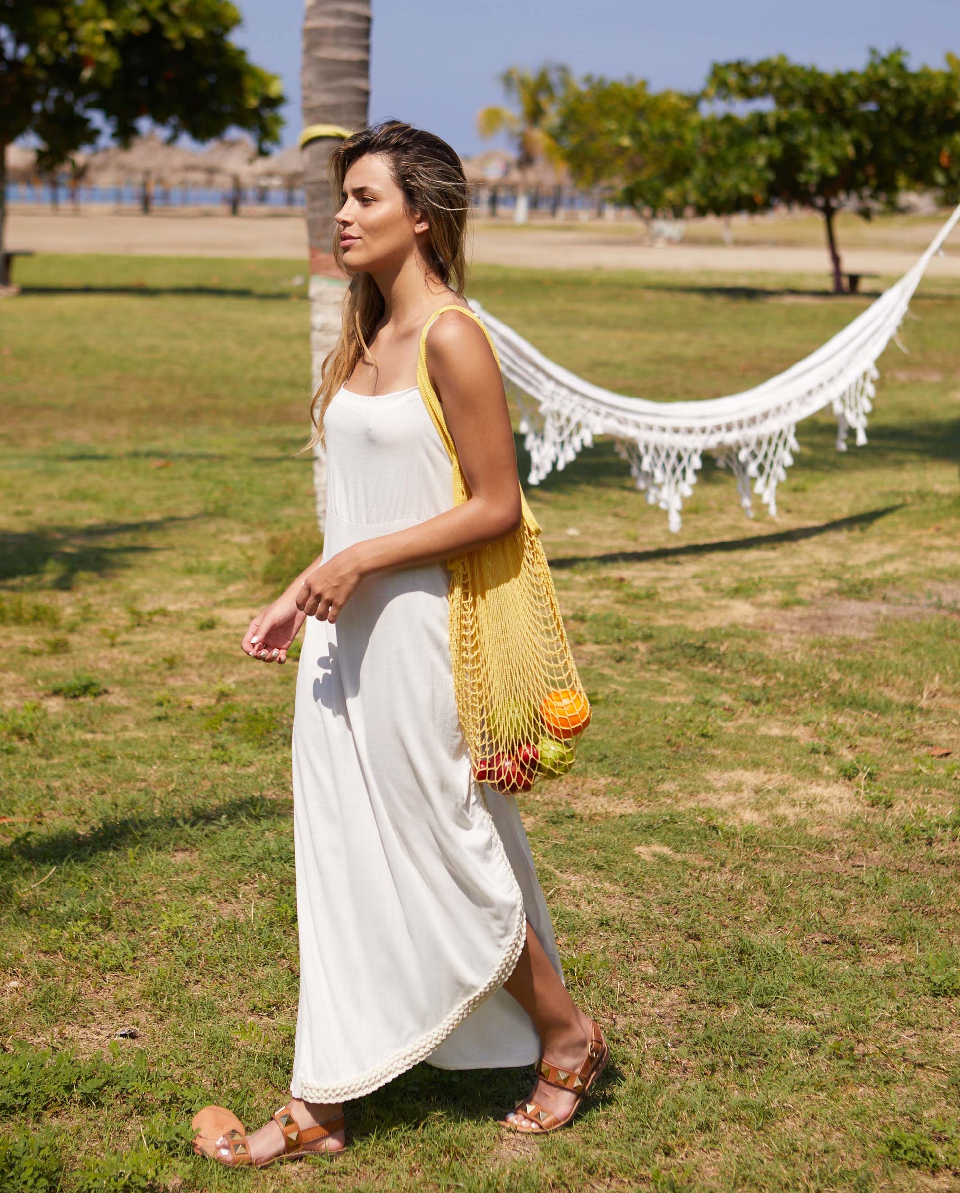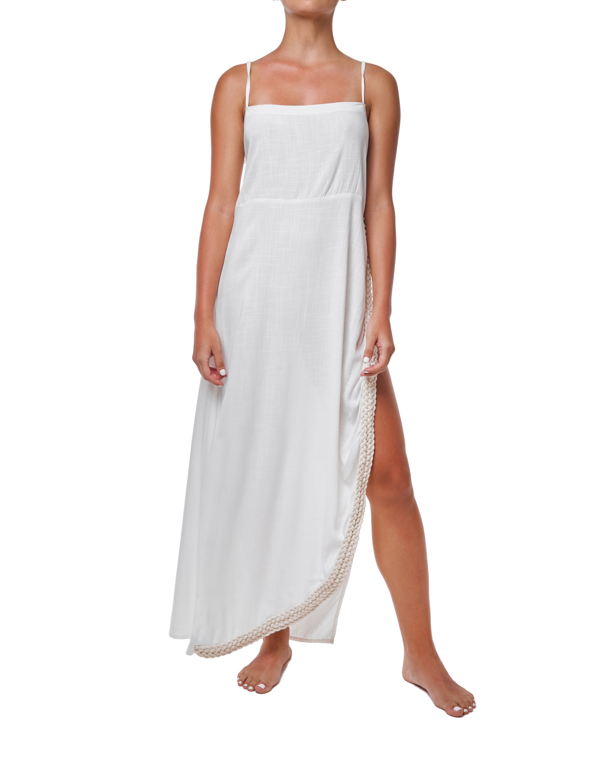 Ankle-length dress features thin adjustable straps and a squared neckline for a sleek, refined silhouette. A curved front panel with hand-braided cotton cords adds an artisanal touch, while a subtle slit enhances ease of movement. The elastic back provides a comfortable, flexible fit.
