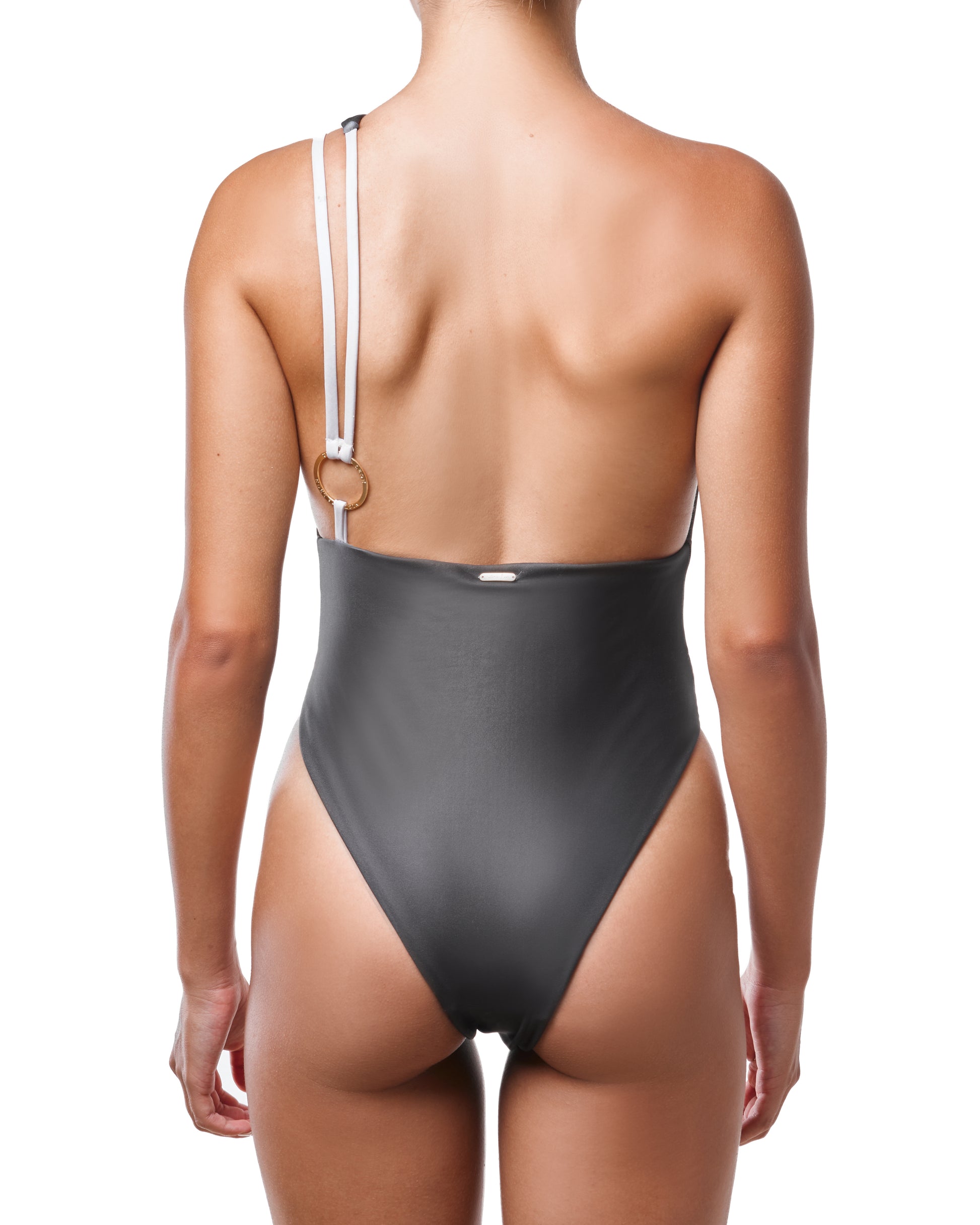Asymmetric one-piece features a frontal opening that subtly exposes the bust, paired with a belted waist with a Monstera leaf buckle in tarnish-free 24k gold plating. High-cut legs hit above the hip bones, while minimal butt coverage and a backless design create an elevated, daring look. Fully lined with invisible seams for a smooth, seamless finish.