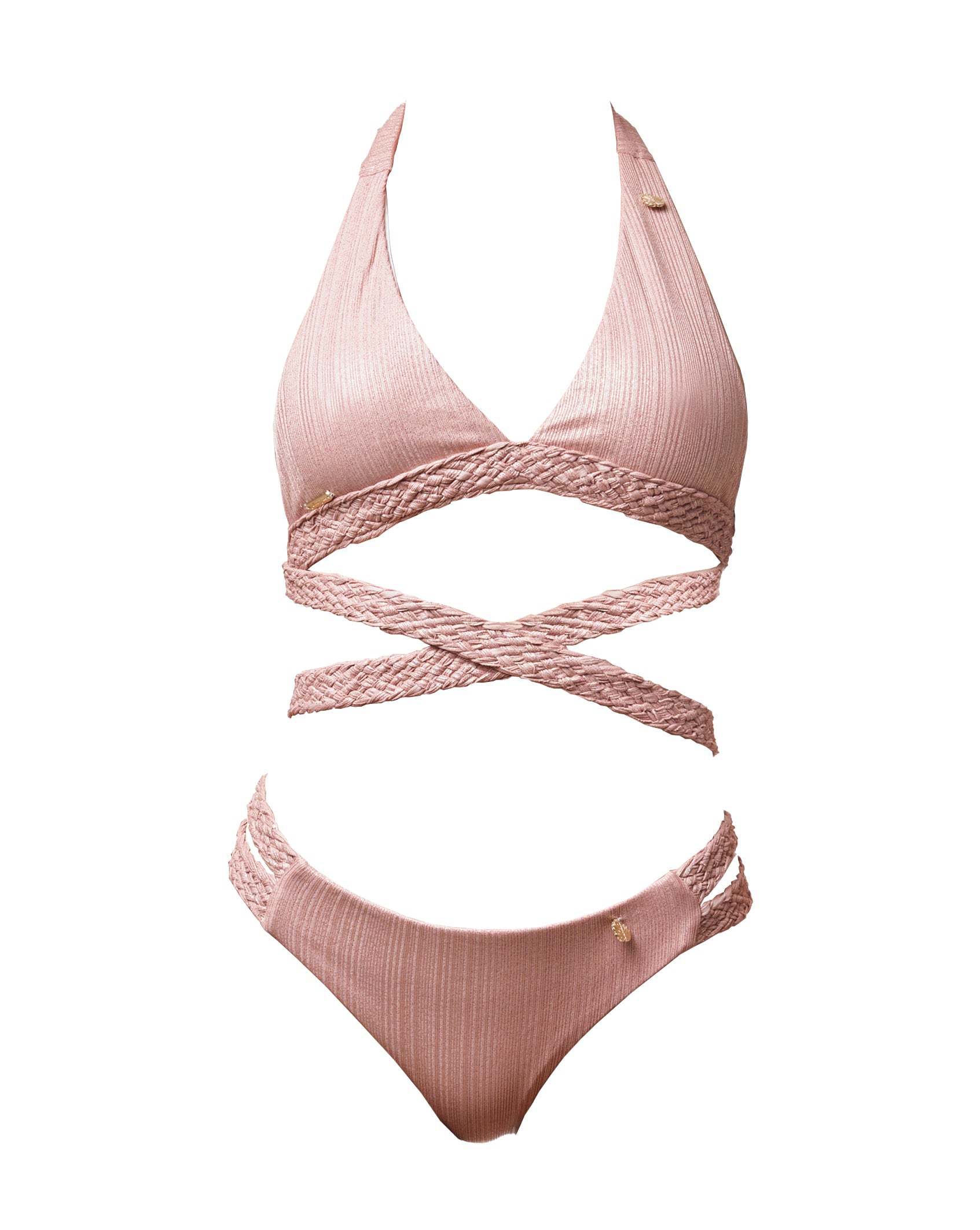 Triangle-style bikini top features long, self-adjustable hand-braided straps that can be wrapped around the torso for a customizable fit. Low-waisted bottoms have double braided side straps for a unique touch. Fully lined with invisible seams for a smooth, seamless finish.