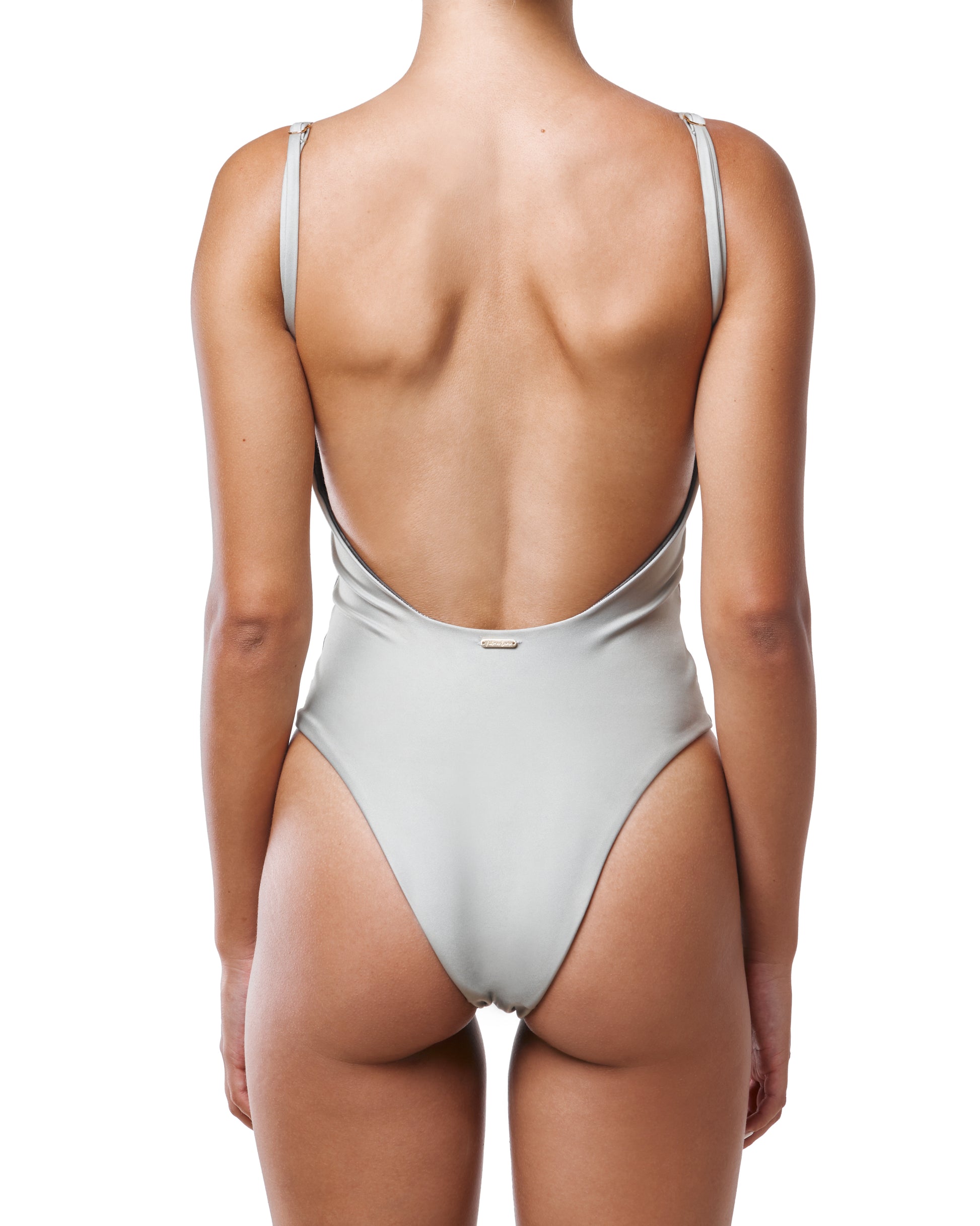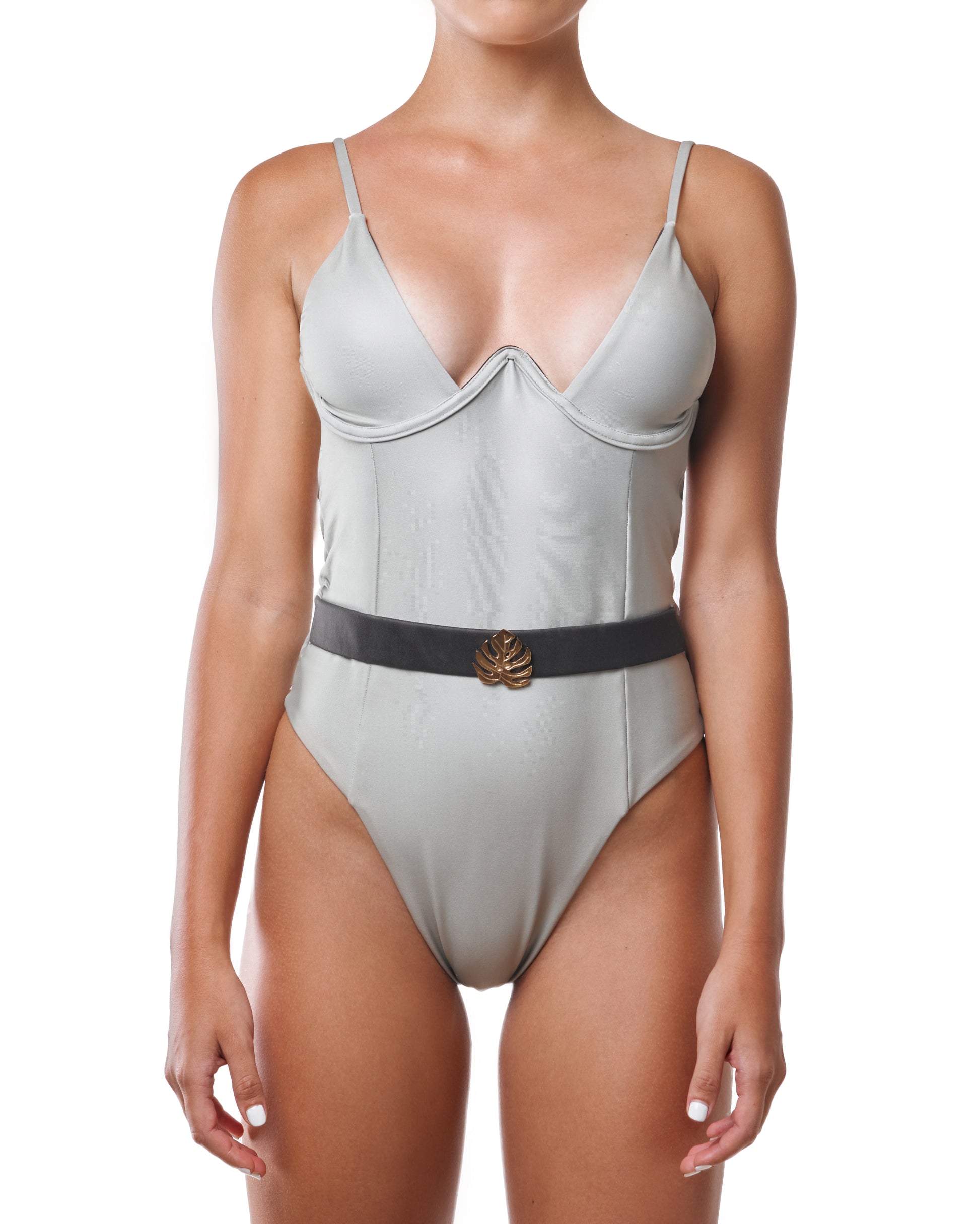 V-shape underwire top features a diagonal cut to subtly showcase the bust, with a backless design and adjustable crisscross straps for a customizable fit. Thin straps and a belted waist with a Monstera leaf buckle in tarnish-free 24k gold-plated material accentuate the waist. Fully lined with invisible seams for a smooth, seamless finish.