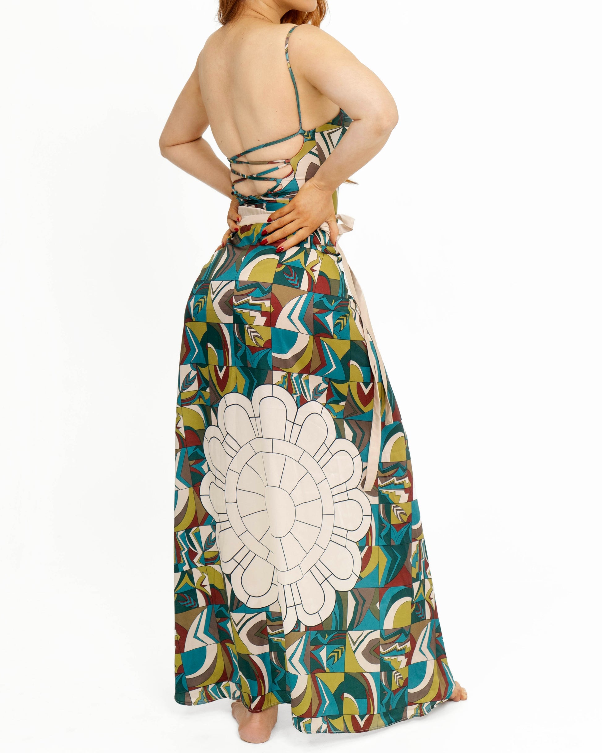 The Rosetta wrapped long skirt features an elegant A-line silhouette with a sewn-in adjustable strap belt for versatile styling. Inspired by the ornate Art Deco ceiling of Maracaibo’s historic Baralt Theater, this piece beautifully complements the Baralt print collection, celebrating Venezuela’s rich cultural and musical heritage.